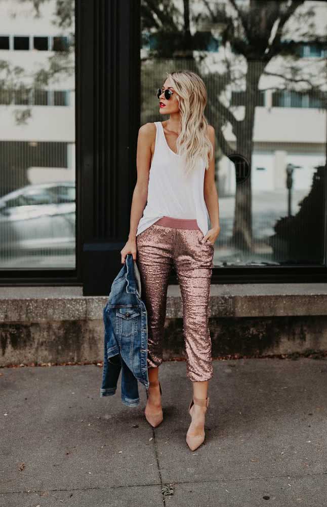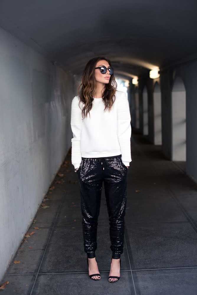 Uma boa dica é apostar na calça jogger de moletom com uma jaquetinha jeans ou um suéter. Nos pés, o tênis é sempre uma boa opção, mas você pode arriscar e ir um pouco além, usando um salto alto, por exemplo.
