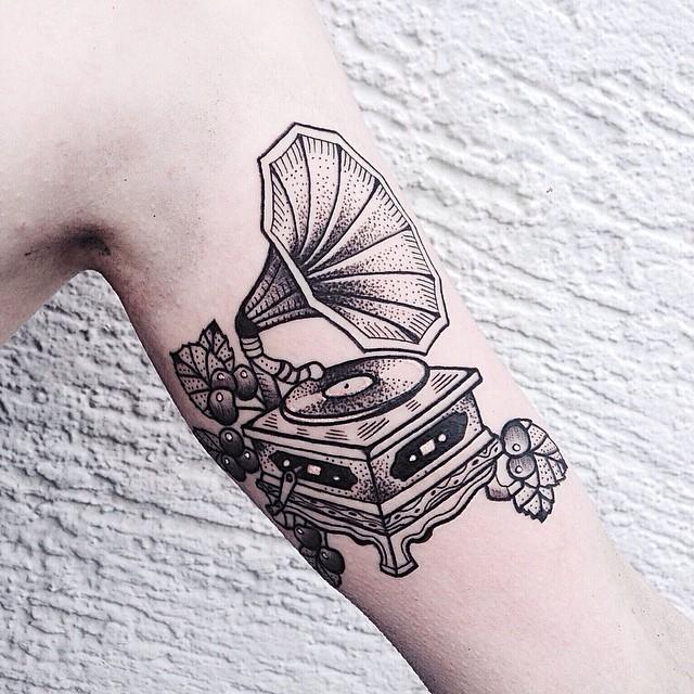 Imagem 3 – Três símbolos reunidos em uma só tatuagem: fone de ouvido, vinil e notas musicais