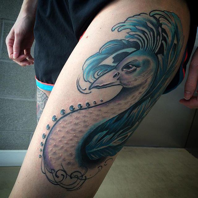 Imagem 37 – Tatuagem de pavão colorida na coxa