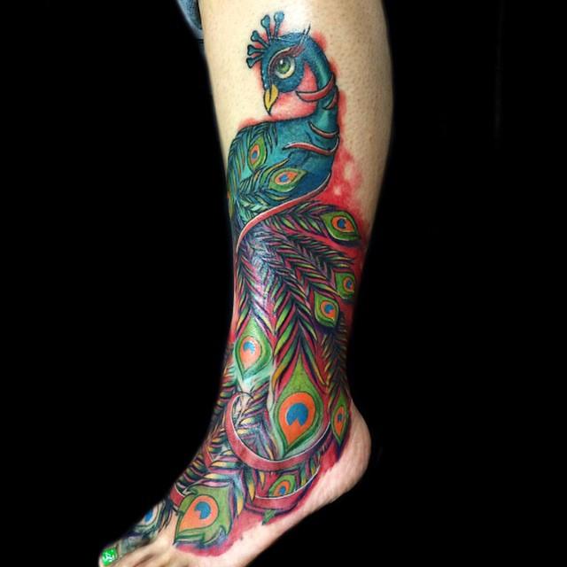 Imagem 22 – Tatuagem de pavão colorida na perna