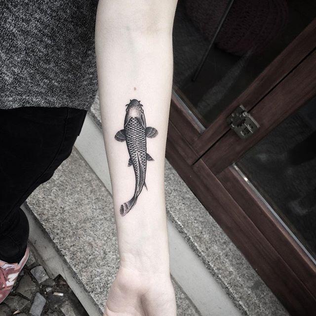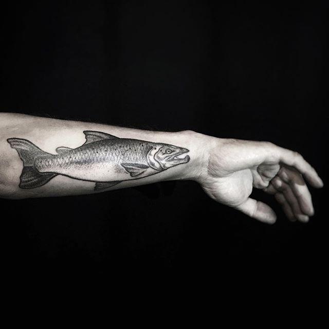Imagem 46 – Tatuagem de peixe em tons de cinza mais escuros no braço