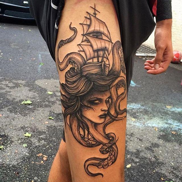 Imagem 31 – Tatuagem de polvo monocromática na perna