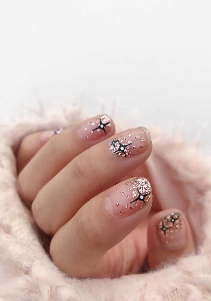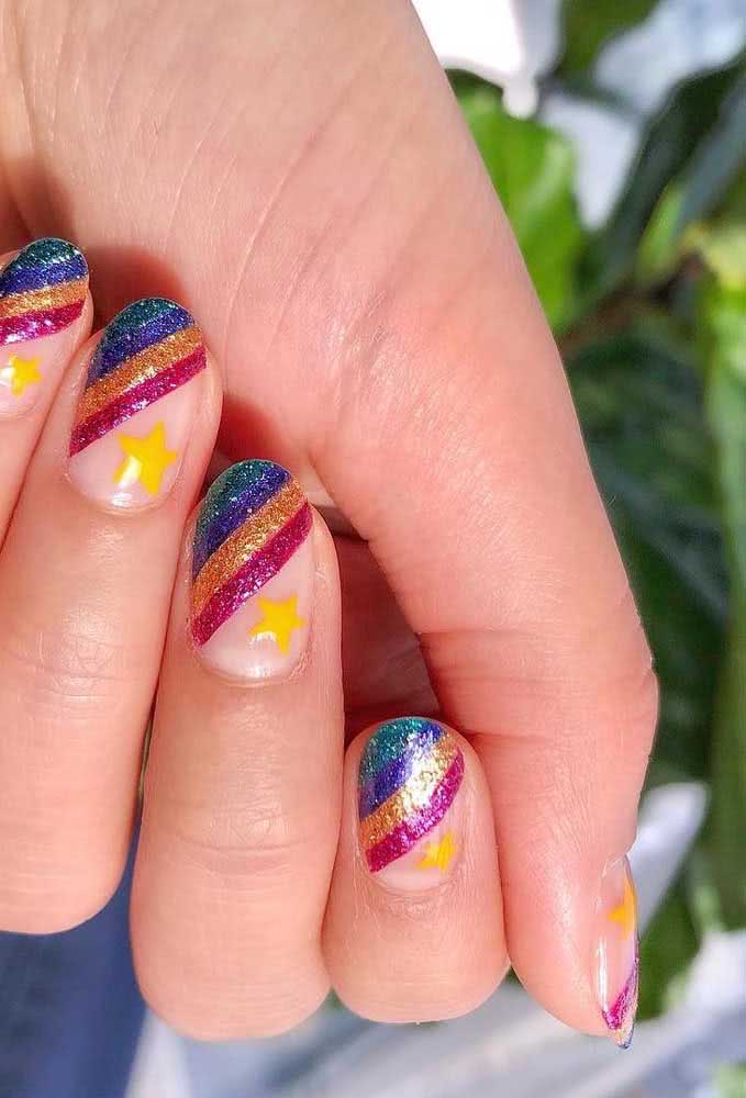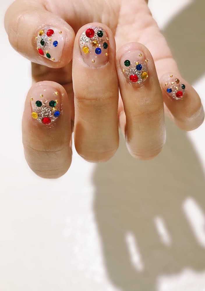 E se junto do glitter você usar também algumas aplicações, como pedrinhas ou adesivos? Só tome cuidado para não exagerar e ficar com as unhas excessivamente decoradas.
