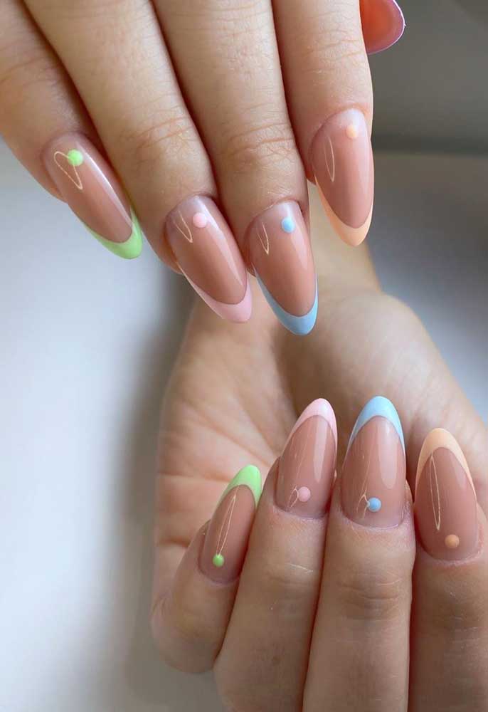 17. Esmalte clarinho no comprimento com francesinha colorida na pontinha, uma unha de cada cor.