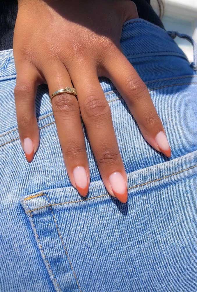 45. E, para finalizar, uma unha francesinha invertida mais grossa (quase uma half nail) com esmalte clarinho e o restante em terracota, numa combinação bem quente!