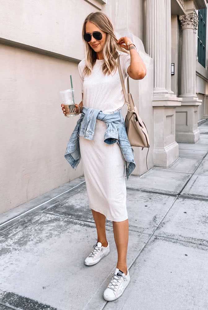 19. Outra opção é este vestido midi estilo camisetão, que fica perfeito com um tênis casual e jaqueta jeans.
